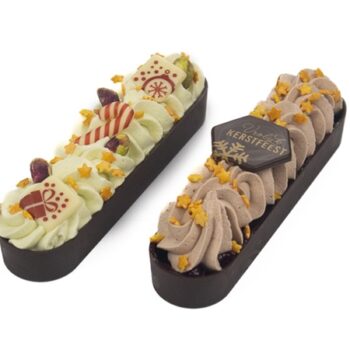 Eentje met een heerlijke chocolade bodem met een vulling van pistache bavoroise en eentje met een vulling van gebonden kersen en chocomousse bavarois.