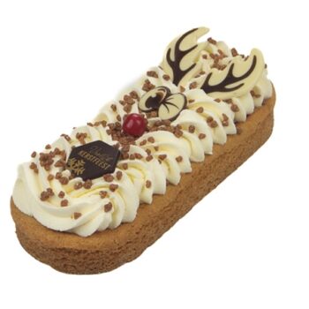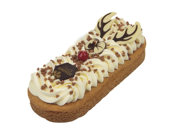 Een roomboterslof met een vulling van pudding, framboos en tiramisu bavarois. Het geheel wordt afgewerkt Kerstdecoratie.