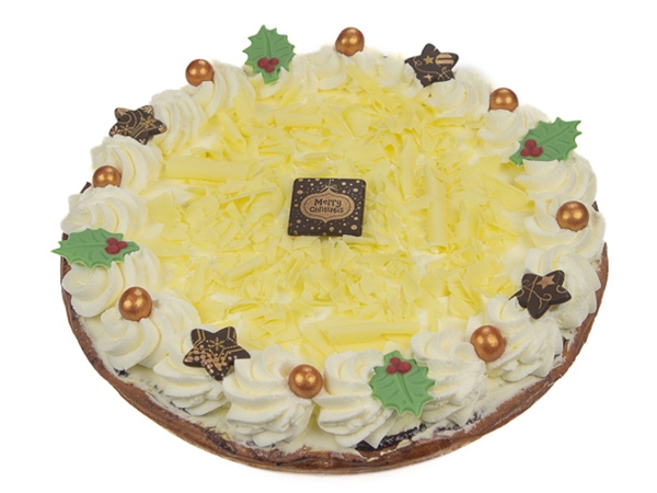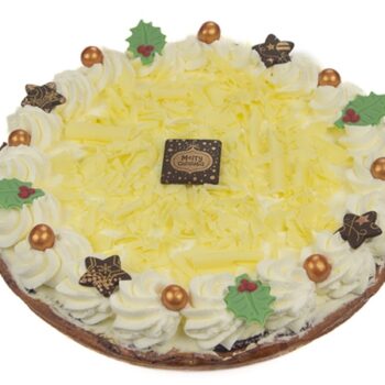 De Kerstvlaai bestaat uit een vlaaideegbodem met gebonden kersen en een laag witte chocoladebavarois. deze wordt geheel afgewerkt in kerstdeco.