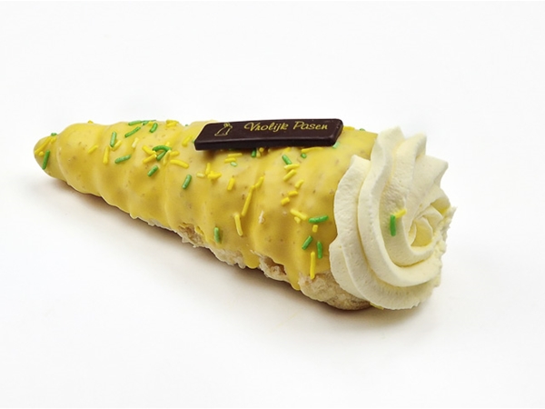 Korstdeeg voorzien van suiker, bros gebakken in de vorm van een hoorntje. Gevuld met advocaatmousse en afgewerkt in Paasstijl.